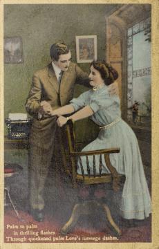 Illustrierte Postkarte; Grafik, polychrom; Typewriter Series No. 202 (3) Rückseite: Vorgesetzter/Mitarbeiter und Sekretärin in romantischer Büroszene, Schreibmaschine im Hintergrund; Text: [...] Through quickened pulse Love's message dashes. Vorderseite beschrieben
