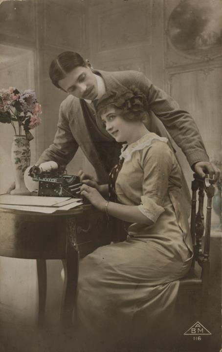 Illustrierte Postkarte; Fotografie, koloriert; Serie ABM 116 Rückseite: Vorgesetzter und Sekretärin mit Schreibmaschine in romantischer Büroszene, Blumen als Dekoration Vorderseite beschrieben