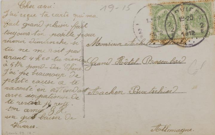 Illustrierte Postkarte; Fotografie, koloriert; Serie ABM 116 Rückseite: Vorgesetzter und Sekretärin mit Schreibmaschine in romantischer Büroszene, Blumen als Dekoration Vorderseite: beschrieben, adressiert an Monsieur Colart, Aachen Burtscheid; Briefmarken Postes Belgique 5c+5c; Poststempel 19-20 V 1912