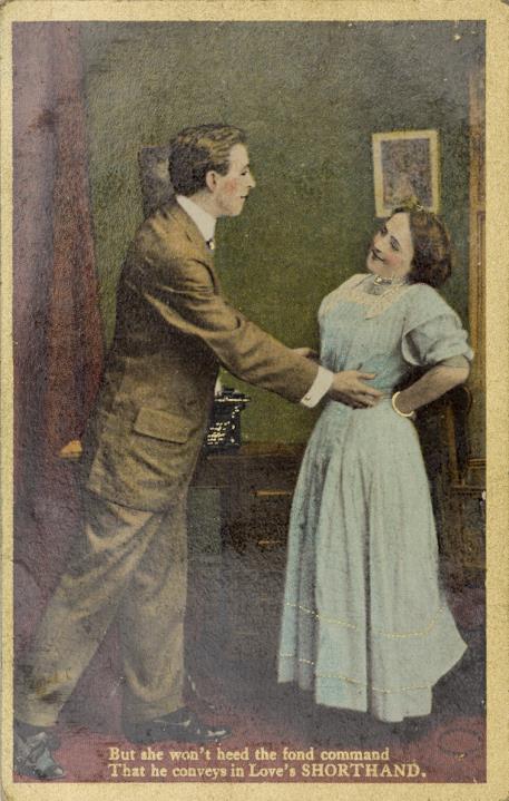 Illustrierte Postkarte; Grafik, polychrom; Typewriter Series No. 202 (4) Rückseite: Vorgesetzter/Mitarbeiter und Sekretärin in romantischer Büroszene, Schreibmaschine im Hintergrund; Text: [...] That he conveys in Love's Shorthand. Vorderseite beschrieben