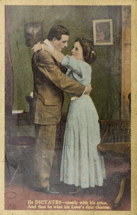 Illustrierte Postkarte; Grafik, polychrom; Typewriter Series No. 202 (5) Rückseite: Vorgesetzter/Mitarbeiter und Sekretärin in romantischer Büroszene; Text: [...] And thus he wins his Love's dear charms. Vorderseite beschrieben