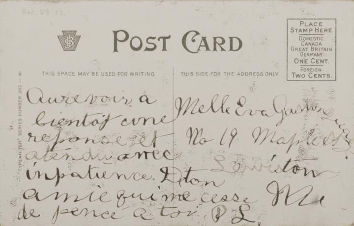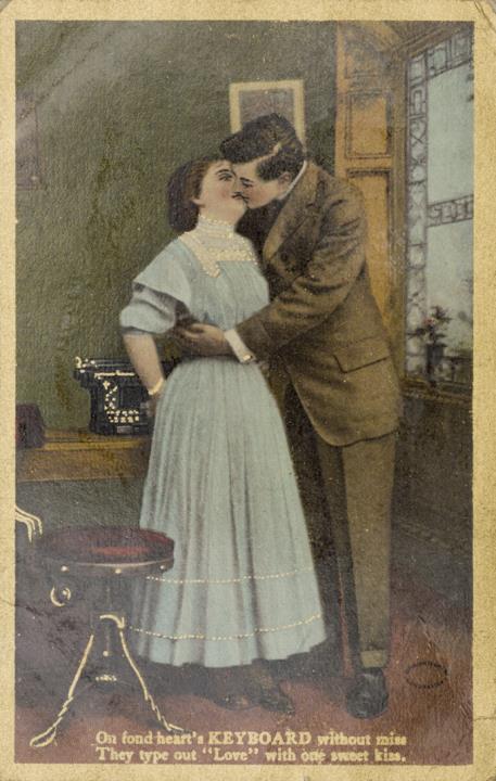 Illustrierte Postkarte; Grafik, polychrom; Typewriter Series No. 202 (6) Rückseite: Vorgesetzter/Mitarbeiter und Sekretärin in romantischer Büroszene, Schreibmaschine im Hintergrund; Text: [...] They type out "Love" with one sweet kiss. Vorderseite beschrieben