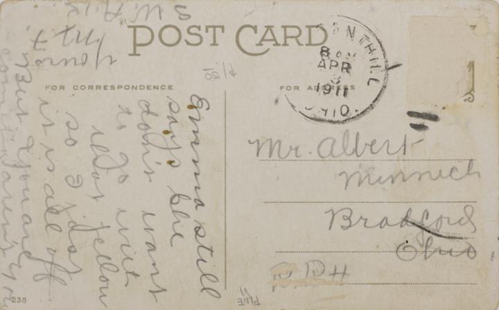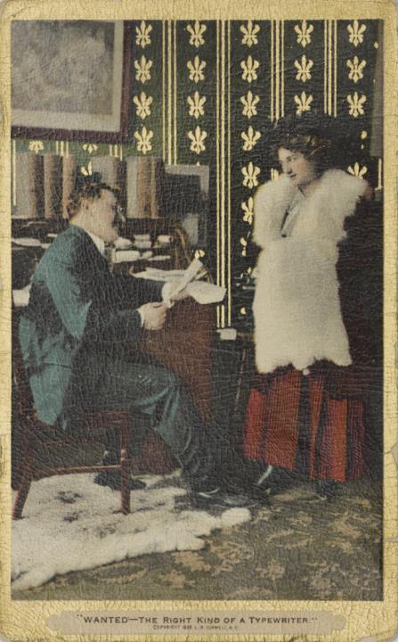 Illustrierte Postkarte; Grafik, polychrom Nr. 238, copyright 1909 L.R. Conwell, N.Y. Rückseite: Büroszene; Vorgesetzter und Sekretärin beim Vorstellungsgespräch Vorderseite: beschrieben, adressiert an Mr. Minnich, Bradford; Poststempel 8 Apr 1911