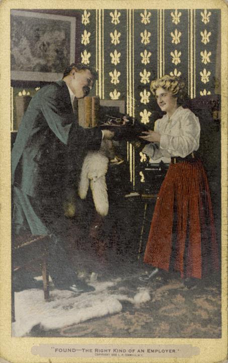 Illustrierte Postkarte; Grafik, polychrom Nr. 239, copyright 1909 L.R. Conwell, N.Y. Rückseite: Büroszene; Vorgesetzter und Sekretärin beim Vorstellungsgespräch, Schreibmaschine im Hintergrund Vorderseite nicht beschrieben
