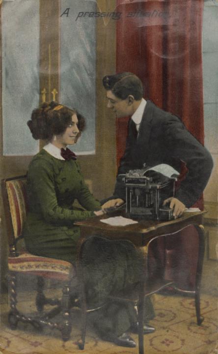 Illustrierte Postkarte; Grafik, polychrom; Serie Nr. 395 Rückseite: Vorgesetzter/Mitarbeiter und Sekretärin mit Schreibmaschine in romantischer Büroszene Vorderseite: beschrieben, adressiert an Miss Mitchell, Plymouth; Briefmarke Postage Revenue (U.K.) Half Penny; Poststempel Oc 24 1911