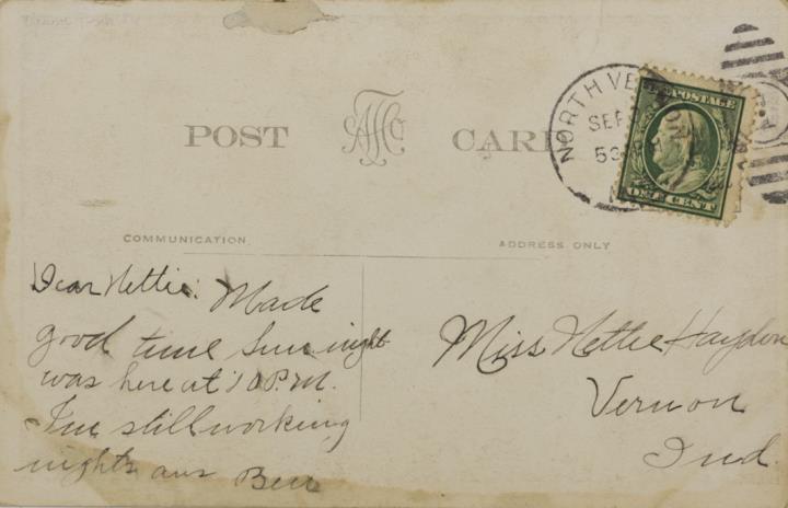 Illustrierte Postkarte; Grafik, Fotografie, polychrom Serie BUT 470, copyright 1909 Taylor Art Co. Rückseite: Vorgesetzter/Mitarbeiter und Sekretärin mit Schreibmaschine in romantischer Büroszene; Vorderseite: beschrieben, adressiert an Miss Haydon, Vernon; Briefmarke U.S. Postage One Cent; Poststempel North Vernon/Sep 30 xx