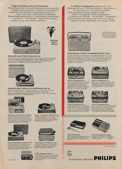 Werbeanzeige für Plattenspieler, Tonbandgeräte und Diktiergeräte Philips polychrom