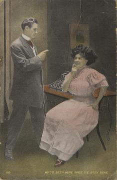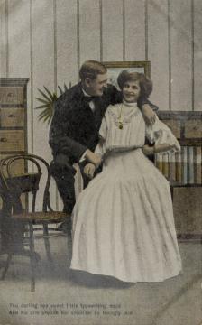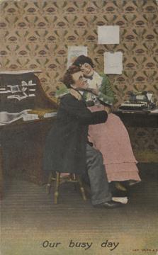 Illustrierte Postkarte; Grafik, polychrom; Serie Nr. 1042 Rückseite: Vorgesetzter und Sekretärin in romantischer Büroszene, Schreibmaschine im Hintergrund Vorderseite: adressiert; Briefmarke U.S. Postage One Cent; Poststempel Indianapolis/Oct 10 1908