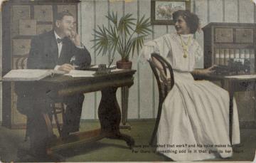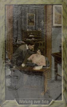 Illustrierte Postkarte; Fotografie, polychrom; Theochrom Serie Nr. 1097 Rückseite: Vorgesetzter/Mitarbeiter und Sekretärin mit Schreibmaschine in romantischer Büroszene, Text in Versform Vorderseite: adressiert an Mr. Beard, Liberty Town