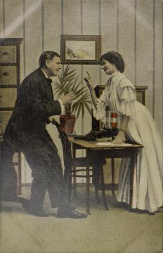 Illustrierte Postkarte; Grafik, Fotografie, polychrom; Theochrom Serie Nr. 1097 Rückseite: Vorgesetzter/Mitarbeiter und Sekretärin in romantischer Büroszene Vorderseite: adressiert; Briefmarke Danmark 3 Øre; Poststempel Kjobnhavn/20.3.1908