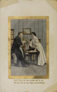 Illustrierte Postkarte; Grafik, Fotografie, polychrom; Theochrom Serie Nr. 1097 Rückseite: Vorgesetzter/Mitarbeiter in romantischer Büroszene; goldene Umrahmung, Text in Versform Vorderseite: beschrieben, adressiert an Miss Fitzpatrick, Kansas City; Briefmarke U.S. Postage One Cent; Poststempel Sep 5 1911