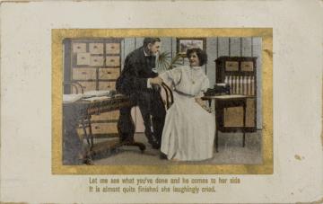 Illustrierte Postkarte; Fotografie, polychrom; Theochrom Serie Nr. 1210-31 Rückseite: Vorgesetzter/Mitarbeiter und Sekretärin mit Schreibmaschine in romantischer Büroszene Vorderseite: beschrieben, adressiert an Miss Poltoy, Flemington; Briefmarke U.S. Postage One Cent; Poststempel Vilas/Jul 25 1910