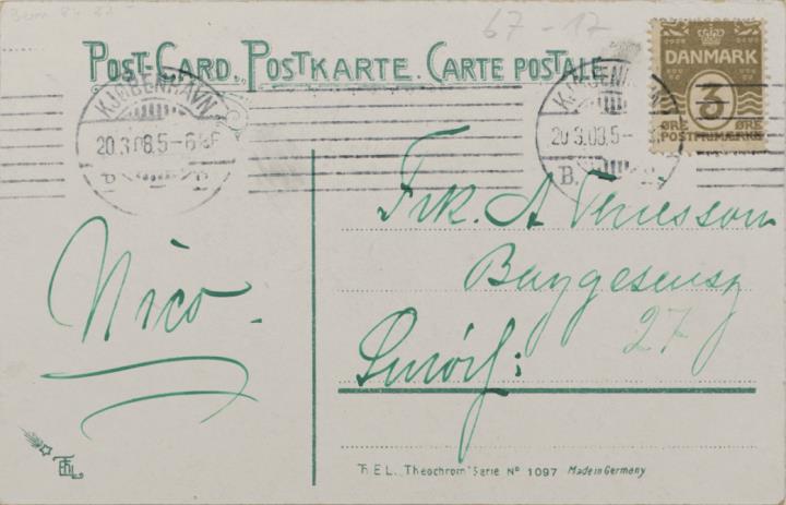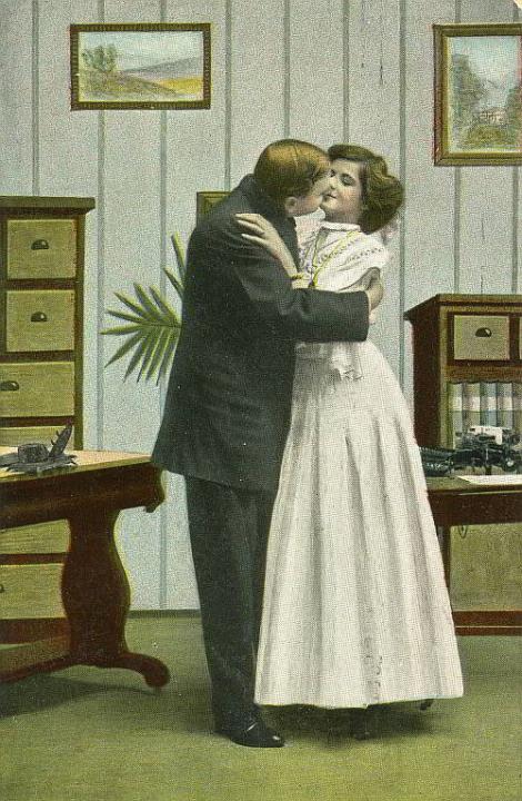 Illustrierte Postkarte; Grafik, Fotografie, polychrom; Theochrom Serie Nr. 1097 Rückseite: Vorgesetzter/Mitarbeiter und Sekretärin in romantischer Büroszene Vorderseite: adressiert; Briefmarke Danmark 3 Øre; Poststempel Kjobnhavn/20.3.1908