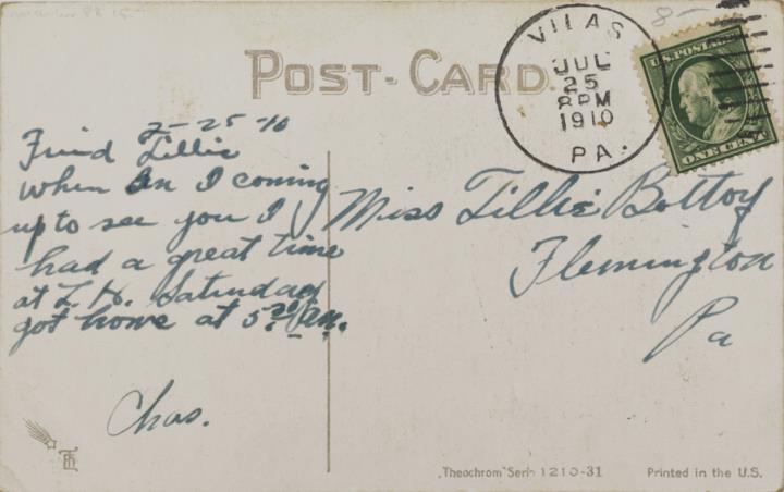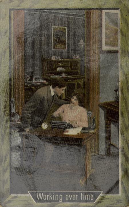 Illustrierte Postkarte; Fotografie, polychrom; Theochrom Serie Nr. 1210-31 Rückseite: Vorgesetzter/Mitarbeiter und Sekretärin mit Schreibmaschine in romantischer Büroszene Vorderseite: beschrieben, adressiert an Miss Poltoy, Flemington; Briefmarke U.S. Postage One Cent; Poststempel Vilas/Jul 25 1910
