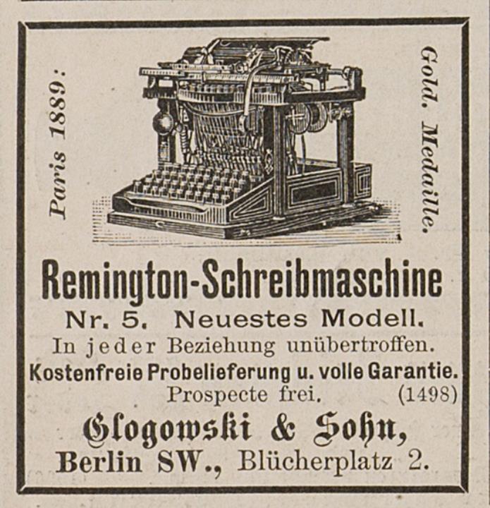 Zeitungsblatt (Illustrirte Zeitung) mit Werbeanzeige für Schreibmaschine Remington monochrom