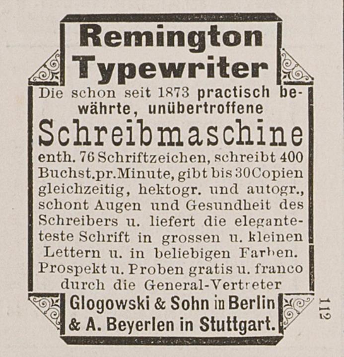 Zeitungsblatt (Illustrirte Zeitung) mit Werbeanzeige für Schreibmaschine Remington monochrom