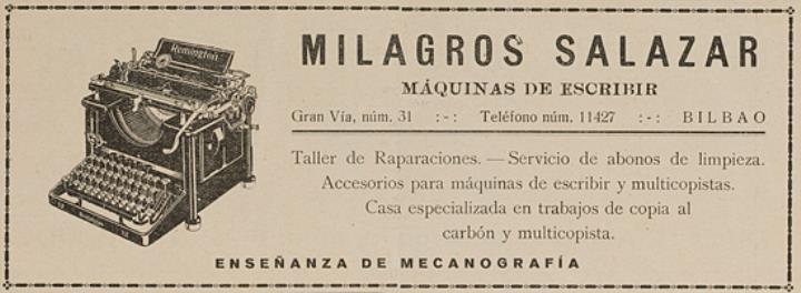 Werbeanzeige für Schreibmaschinenhandlung Milagros Salazar, Bilbao; auf Karton geklebt monochrom