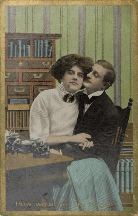 Illustrierte Postkarte; Fotografie, polychrom; Theochrom Serie Nr. 1131/25 Rückseite: Vorgesetzter/Mitarbeiter und Sekretärin in romantischer Büroszene Vorderseite nicht beschrieben