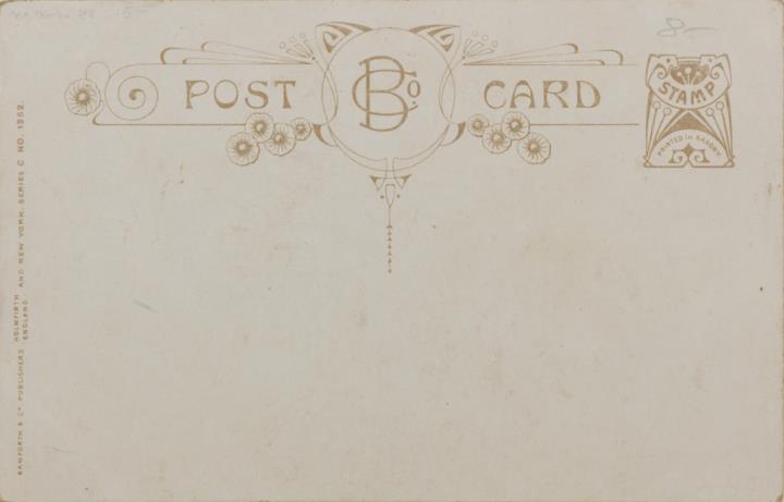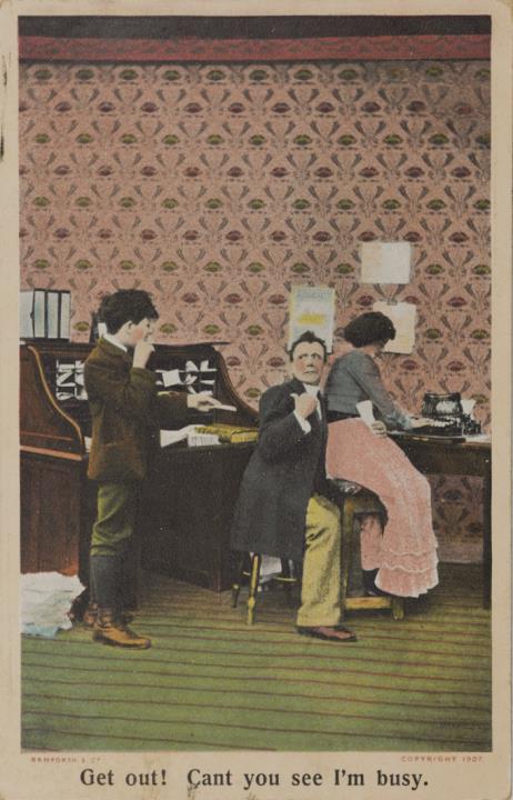 Illustrierte Postkarte; Grafik, polychrom Serie C Nr. 1252, copyright 1907 Bamforth & Co. Rückseite: Büroszene; Mitarbeiter/Vorgesetzter und Sekretärin mit Schreibmaschine, daneben Bürojunge mit Brief Vorderseite nicht beschrieben