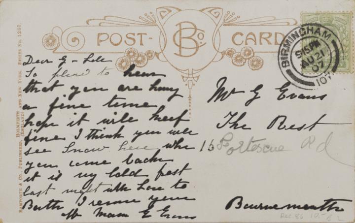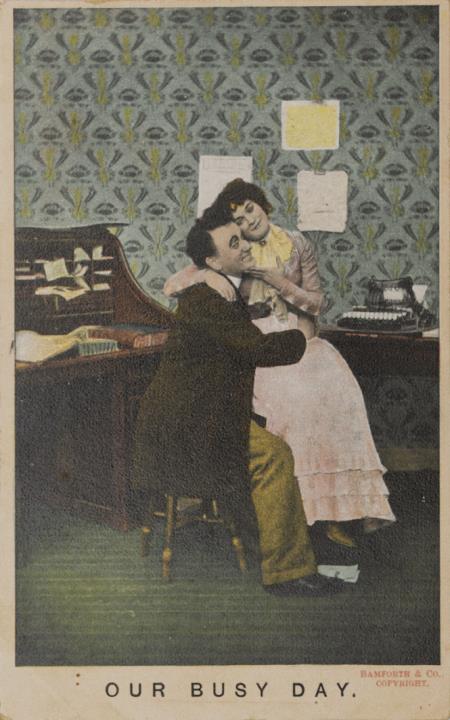 Illustrierte Postkarte; Grafik, polychrom Serie Nr. 1260, copyright Bramford & Co. Rückseite: Vorgesetzter/Mitarbeiter und Sekretärin mit Schreibmaschine in romantischer Büroszene Vorderseite: beschrieben; adressiert an Mr. Evans, Bournemouth; Briefmarke Postage Revenue (U.K.) Half Penny; Poststempel Birmingham/Au 21 1907