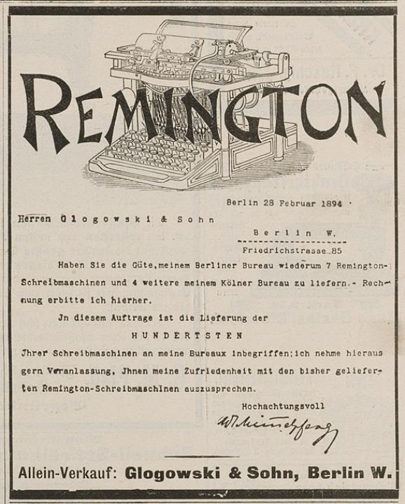 Zeitungsblatt (Fliegende Blätter) mit Werbeanzeige für Schreibmaschine Remington monochrom