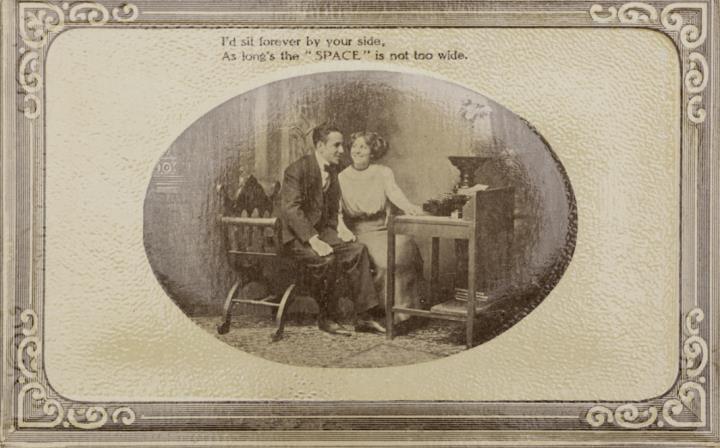 Illustrierte Postkarte; Grafik, Fotografie, monochrom; Keyboard Series 65-2 Rückseite: Vorgesetzter/Mitarbeiter und Sekretärin mit Schreibmaschine in romantischer Büroszene; oval umrahmt, Text [...] As long's the "Space" is not too wide Vorderseite nicht beschrieben