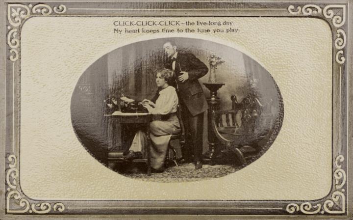 Illustrierte Postkarte; Grafik, Fotografie, monochrom; Keyboard Series 65-3 Rückseite: Vorgesetzter/Mitarbeiter und Sekretärin mit Schreibmaschine in romantischer Büroszene; oval umrahmt, Text [...] My heart keeps time to the tune you play Vorderseite nicht beschrieben