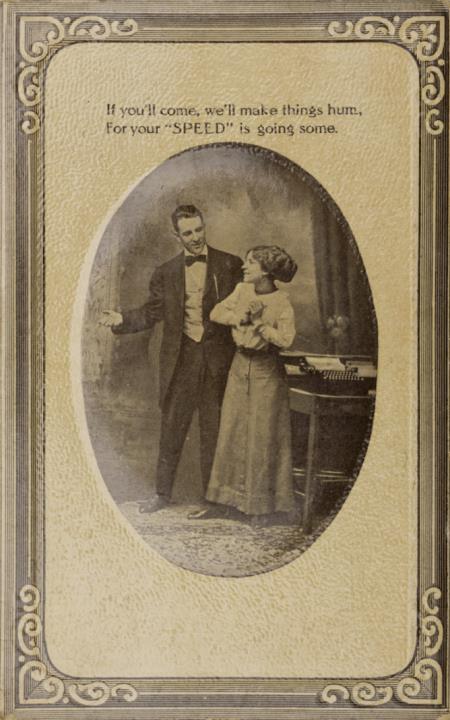 Illustrierte Postkarte; Grafik, Fotografie, monochrom; Keyboard Series 65-7 Rückseite: Vorgesetzter/Mitarbeiter und Sekretärin mit Schreibmaschine in romantischer Büroszene; oval umrahmt, Text [...] For your "Speed" is going some. Vorderseite nicht beschrieben