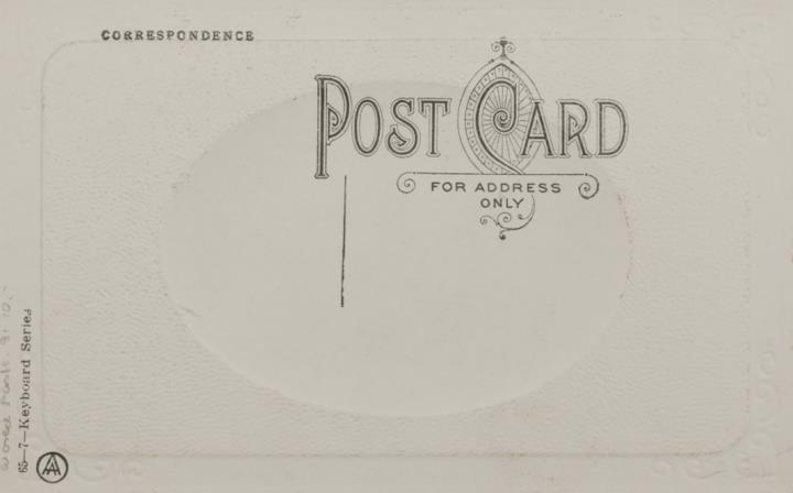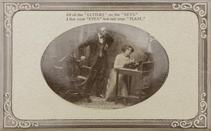 Illustrierte Postkarte; Grafik, Fotografie, monochrom; Keyboard Series 65-7 Rückseite: Vorgesetzter/Mitarbeiter und Sekretärin mit Schreibmaschine in romantischer Büroszene; oval umrahmt, Text [...] I like your "Eyes" but not your "Tease" Vorderseite nicht beschrieben