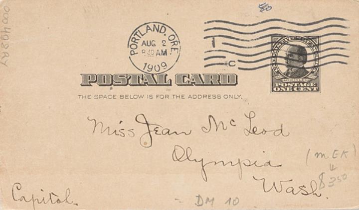Postkarte Ganzsache; Mischtechnik, monochrom Rückseite: aufgeklebtes Bild (Hände auf einer Schreibmaschine tippend) neben Text in Versform (Handschrift, Tusche) Vorderseite: adressiert an Miss McLeod, Olympia; aufgedruckte Briefmarke U.S. Postage One Cent; Poststempel Portland/Aug 2 1909