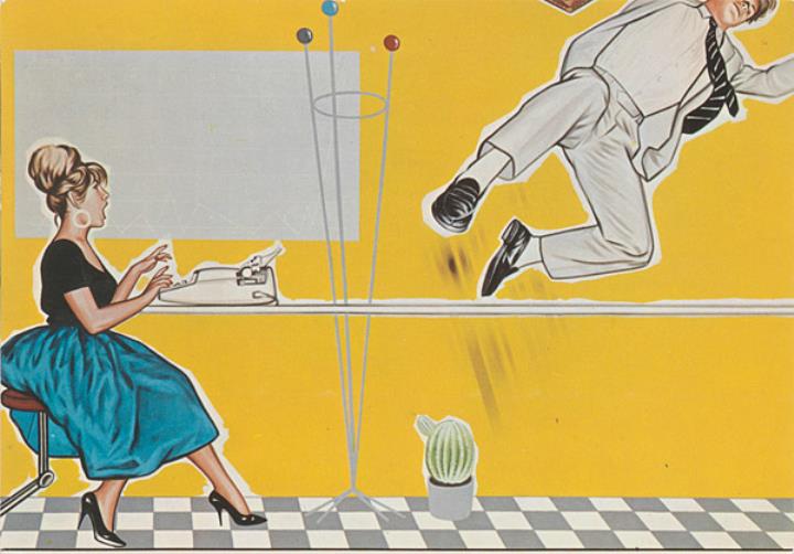 Illustrierte Postkarte; Grafik, polychrom; Nr. H 236 - Illustrateurs Rückseite: Büroszene; Sekretärin mit Schreibmaschine, Mann/Angestellter im Raum schwebend Vorderseite nicht beschrieben