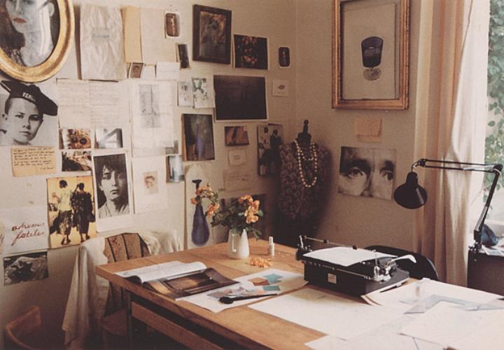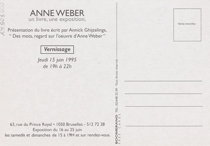 Illustrierte Postkarte; Fotografie, polychrom Rückseite: Ansicht Privatbüro mit Schreibmaschine Vorderseite mit Beschreibungstext: Einladung zur Vernissage "Anne Weber. un livre, une exposition" 15.05.1995