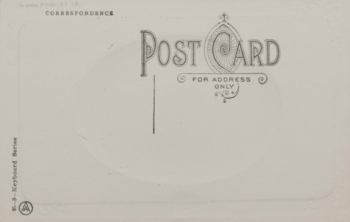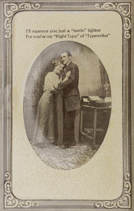 Illustrierte Postkarte; Grafik, Fotografie, monochrom; Keyboard Series 65-9 Rückseite: Vorgesetzter/Mitarbeiter und Sekretärin mit Schreibmaschine in romantischer Büroszene; oval umrahmt, Text [...] For you're my "Right Type" of "Typewriter" Vorderseite nicht beschrieben