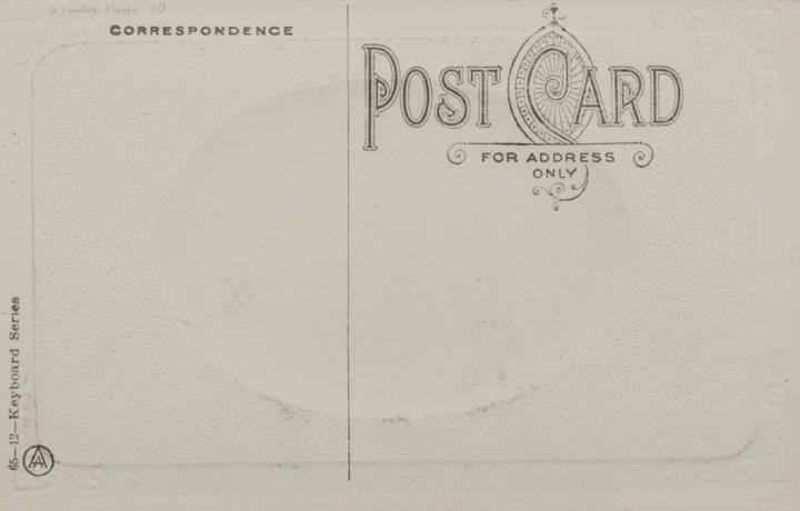 Illustrierte Postkarte; Grafik, Fotografie, monochrom; Keyboard Series 65-12 Rückseite: Vorgesetzter/Mitarbeiter und Sekretärin mit Schreibmaschine in romantischer Büroszene; oval umrahmt, Text [...] Don't put a "Bar-Lock" on your lips. Vorderseite nicht beschrieben