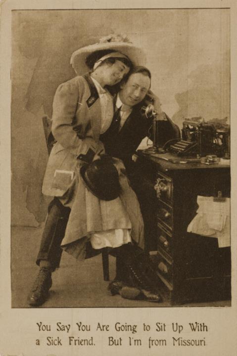 Illustrierte Postkarte; Fotografie, monochrom; Serie Nr. 110; Rückseite: romantische Büroszene; Vorgesetzter mit Frau auf seinem Schoß beim Telefonieren; Vorderseite nicht beschrieben