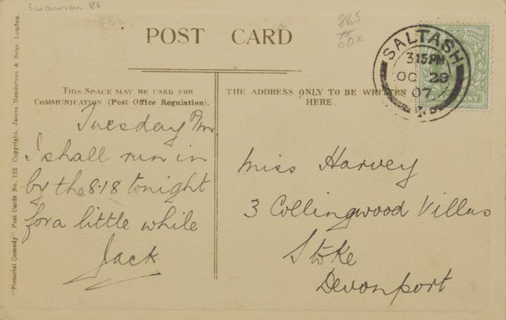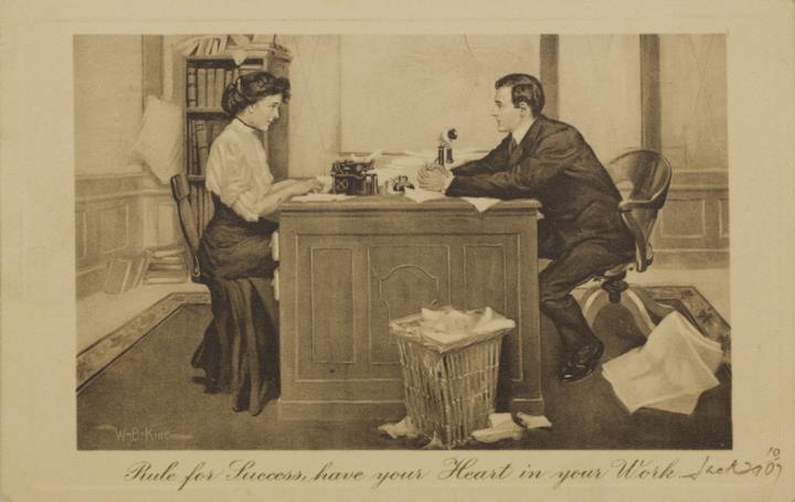 Illustrierte Postkarte; Grafik, monochrom Serie Nr. 122, copyright James Henderson & Sons, London Rückseite: Vorgesetzter/Mitarbeiter und Sekretärin mit Schreibmaschine in romantischer Büroszene, Text: [...] have your Heart in your Work. Vorderseite: beschrieben; adressiert an Miss Harvey, Devonport; Briefmarke Postage Revenue (U.K.) Half Penny; Poststempel Saltash/Oc 29 1907