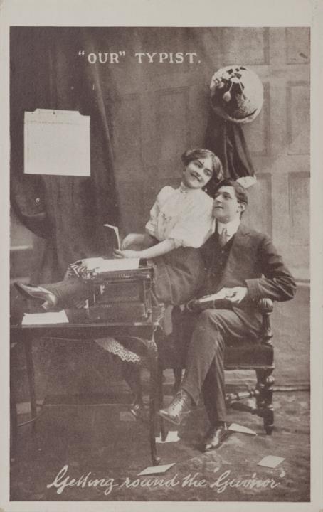 Illustrierte Postkarte; Fotografie, monochrom; Serie Nr. 131; Rückseite: Vorgesetzter/Mitarbeiter und Sekretärin in romantischer Büroszene, kleiner Tisch mit Schreibmaschine, Text: Getting round the Guv'nor. Vorderseite nicht beschrieben