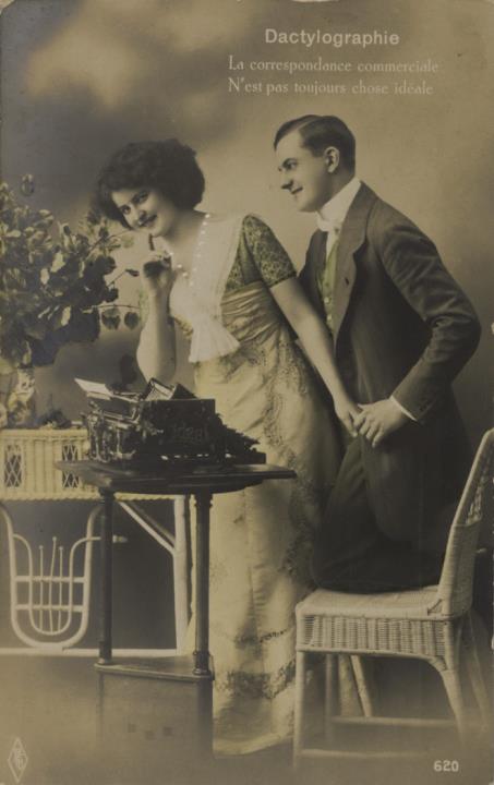 Illustrierte Postkarte; Fotografie, koloriert; Serie PFB 620; Rückseite: Vorgesetzter/Mitarbeiter und Sekretärin mit Schreibmaschine in romantischer Büroszene, Text: La correspondance commerciale n'est pas toujours chose idéale Vorderseite beschrieben