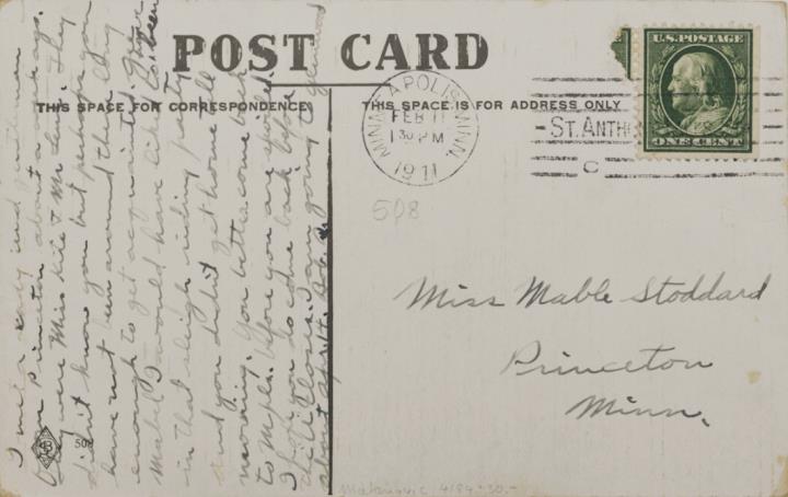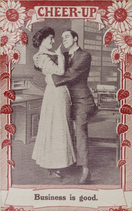 Illustrierte Postkarte; Grafik, polychrom; Serie SB 508 Rückseite: Vorgesetzter/Mitarbeiter und Sekretärin mit Schreibmaschine in romantischer Büroszene, Tisch mit Schreibmaschine Vorderseite: beschrieben; adressiert an Miss Stoddard, Princeton; Briefmarke U.S. Postage One Cent; Poststempel Minneapolis/Feb 11 1911