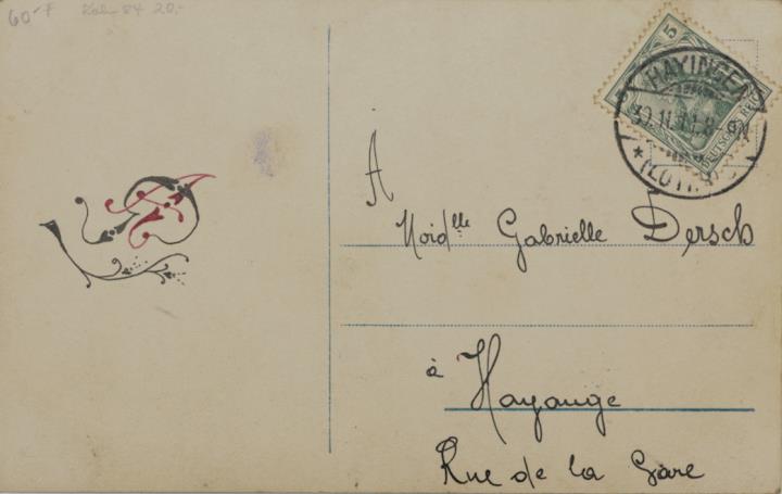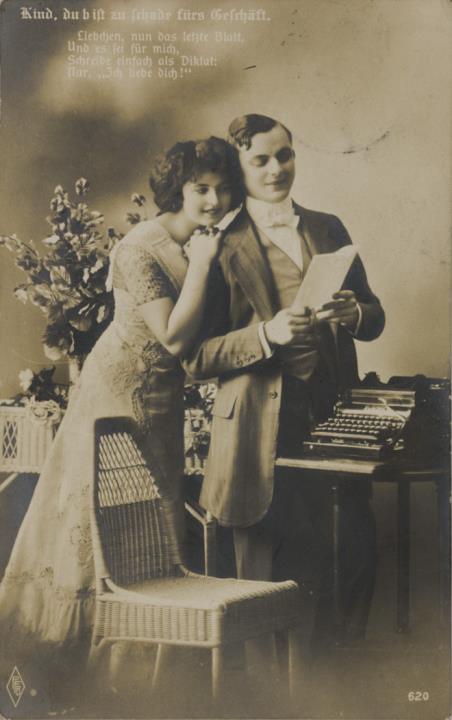 Illustrierte Postkarte; Fotografie, monochrom; Serie PFB 620 Rückseite: Vorgesetzter/Mitarbeiter und Sekretärin mit Schreibmaschine in romantischer Büroszene, Blumen als Dekoration, Text in Versform Vorderseite: adressiert an Mad.lle Dersch, Hayange; Briefmarke Deutsches Reich 5 Pf.; Poststempel Hayingen/30.11.1911