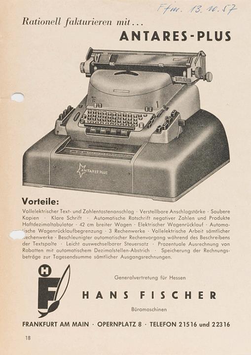 Werbeanzeige für Schreib- und Buchungsmaschine Antares Plus monochrom