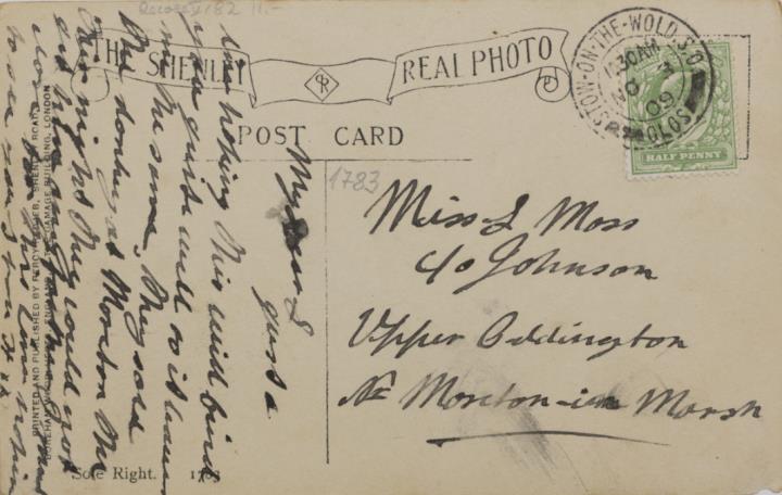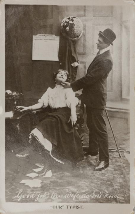Illustrierte Postkarte; Fotografie, monochrom; Serie Sole Right 1783 Rückseite: Vorgesetzter/Mitarbeiter und Sekretärin mit Schreibmaschine in romantischer Büroszene, Text: Good job the wife doesn't know. Vorderseite: beschrieben; adressiert an Miss Moss, Upper Addington; Briefmarke Postage Revenue (U.K.) Half Penny; Poststempel Stow-on-the-Wold/No 3 1909