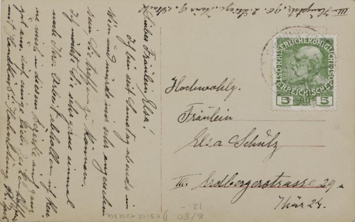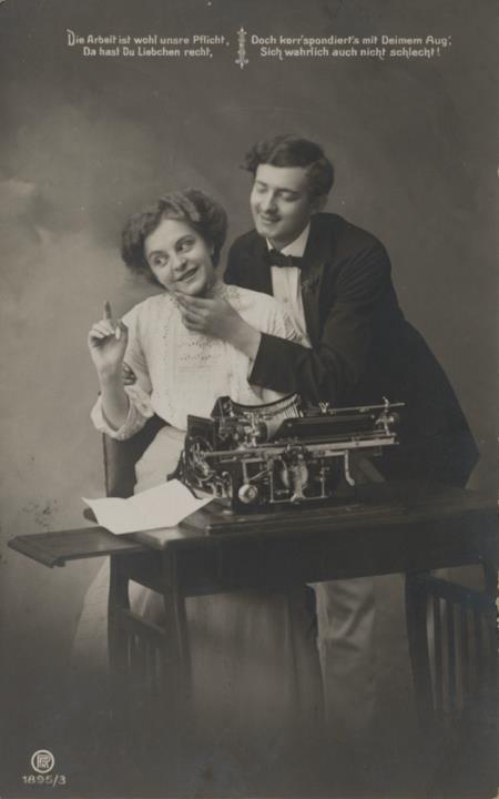 Illustrierte Postkarte; Fotografie, monochrom; Serie RPH 1895/3 Rückseite: Vorgesetzter/Mitarbeiter und Sekretärin mit Schreibmaschine in romantischer Büroszene, Text in Versform Vorderseite: beschrieben; adressiert an Fräulein Schulz, Wien; Briefmarke K.K. Österreichische Post 5 Heller; Poststempel unleserlich