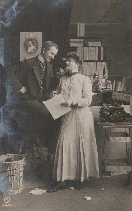 Illustrierte Postkarte; Fotografie, monochrom; Serie AL 3737/3 Rückseite: Vorgesetzter/Mitarbeiter und Sekretärin in romantischer Büroszene, kleiner Tisch mit Schreibmaschine Vorderseite beschrieben