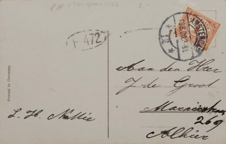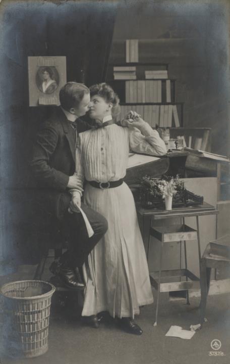 Illustrierte Postkarte; Fotografie, monochrom; Serie AL 3737/6 Rückseite: Vorgesetzter/Mitarbeiter und Sekretärin in romantischer Büroszene, kleiner Tisch mit Schreibmaschine Vorderseite: beschrieben; adressiert an Heer de Groot; Briefmarke Nederland 1 Cent; Poststempel Amsterdam/03.8.1909