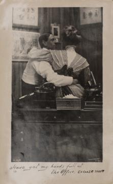 Illustrierte Postkarte; Fotografie, monochrom Rückseite: Vorgesetzter/Mitarbeiter und Sekretärin in romantischer Büroszene Vorderseite: adressiert; Briefmarke U.S. Postage One Cent; Poststempel Arcade/Feb 13 1908