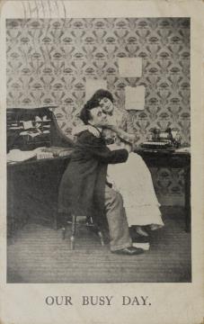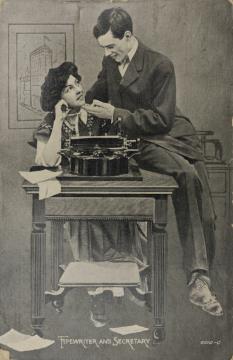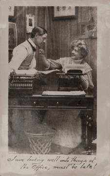 Illustrierte Postkarte; Fotografie, monochrom; Nr. 6010-C Rückseite: Vorgesetzter/Mitarbeiter und Sekretärin mit Schreibmaschine in romantischer Büroszene Vorderseite: beschrieben; adressiert an Miss Lesley, Arcadia; Briefmarke U.S. Postage One Cent; Bristol/Jul 28 1909