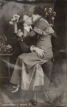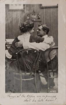 Illustrierte Postkarte; Fotografie, monochrom; Davidson Bros. Nr. 4265 Rückseite: Vorgesetzter/Mitarbeiter und Sekretärin in romantischer Büroszene Vorderseite: beschrieben; adressiert an Miss Adams, Tooting; Briefmarke Postage Revenue (U.K.) Half Penny; Poststempel Au 12 1909