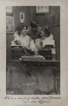 Illustrierte Postkarte; Fotografie, monochrom; Davidson Bros. Nr. 4266 Rückseite: Vorgesetzter/Mitarbeiter und zwei Sekretärinnen mit Schreibmaschine in romantischer Büroszene Vorderseite: beschrieben; adressiert an Gunner Mills, Kent; Briefmarke Postage Revenue (U.K.) Half Penny; Poststempel Tilbury/Ja 30 1909