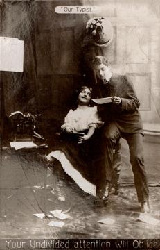 Illustrierte Postkarte; Fotografie, monochrom; Davidson Bros. Nr. 4264 Rückseite: Vorgesetzter/Mitarbeiter und Sekretärin mit Schreibmaschine in romantischer Büroszene Vorderseite: beschrieben; adressiert an Mr. Dray, Brixton; Briefmarke Postage Revenue (U.K.) Half Penny; Poststempel Au 12 1909